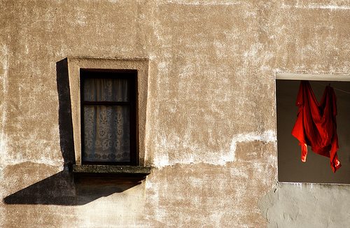 En esta fachada se encuentran dos ventanas, la una distinta a la otra. Una ventana situada más a la derecha, en ella vive una señora mayor, es conservadora, defensora de la ética, se esconde tras una persiana tradicional que la sumerge en su propia penumbra y sí, la persona que vive tras ella es religiosa.